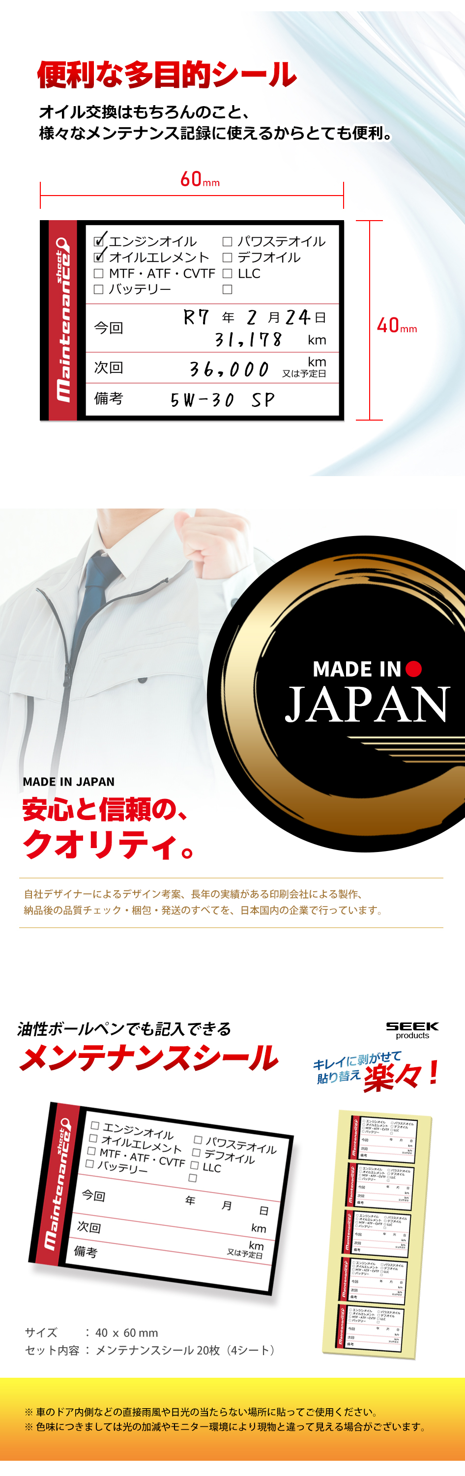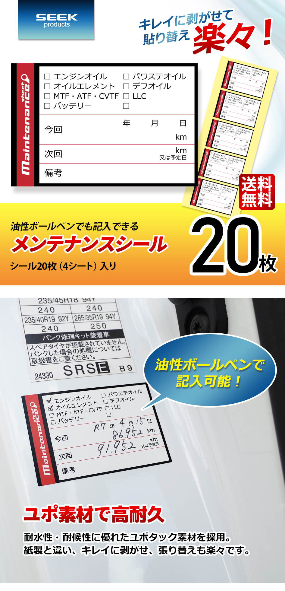 オイル交換はもちろんのこと様々な整備記録に使えるステッカー。油性ボールペンでも記入できる耐水性・耐候性に優れたユポタックを採用。紙製と違い、キレイに剥がせ、張り替えも楽々です。(20枚/50枚/100枚/200枚)