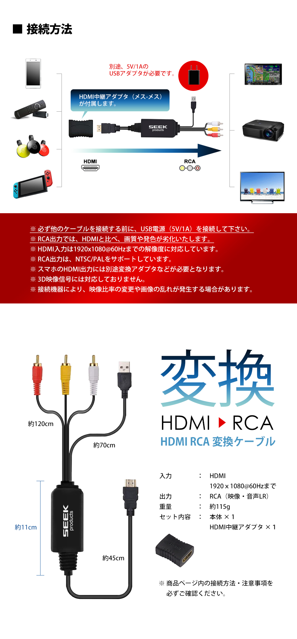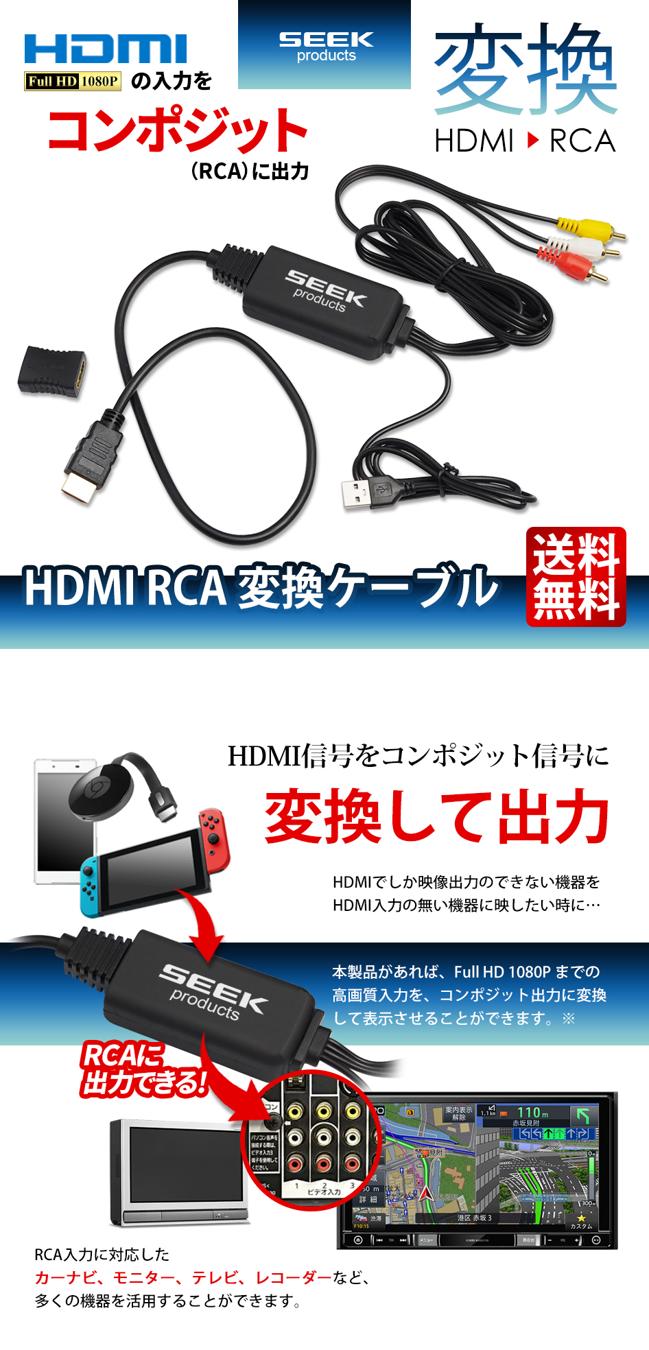 HDMI RCA 変換ケーブル HDMI入力のないカーナビ、モニター、テレビ、ディスプレイ、モニター、レコーダーなどにHDMI対応機器の映像を映すことができる変換ケーブルです。 メーカー希望小売価格 3,280円(税込) ↓ 割引価格で絶賛販売中 ↓ Yahoo!ショッピング 楽天市場 amazon << 前のページに戻る