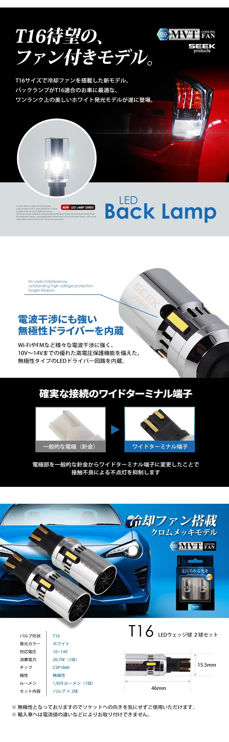 メッキボディ MVTシリーズ (T16) 冷却ファンを搭載したT16LEDバルブの進化系。新たに高級感漂うメッキボディを装着し新登場。バックランプ専用(爆光モデル)、ウインカー専用(抵抗内蔵)の2色展開。(形状:T16)(カラー:ホワイト、アンバー)※参考画像:ホワイト メーカー希望小売価格 7,980円(税込) ↓ 割引価格で絶賛販売中 ↓ T16 バックランプ用 ホワイト発光 バックランプ Yahoo!ショッピング 楽天市場 T16 ウインカー用 アンバー発光 ウインカー Yahoo!ショッピング 楽天市場 << 前のページに戻る