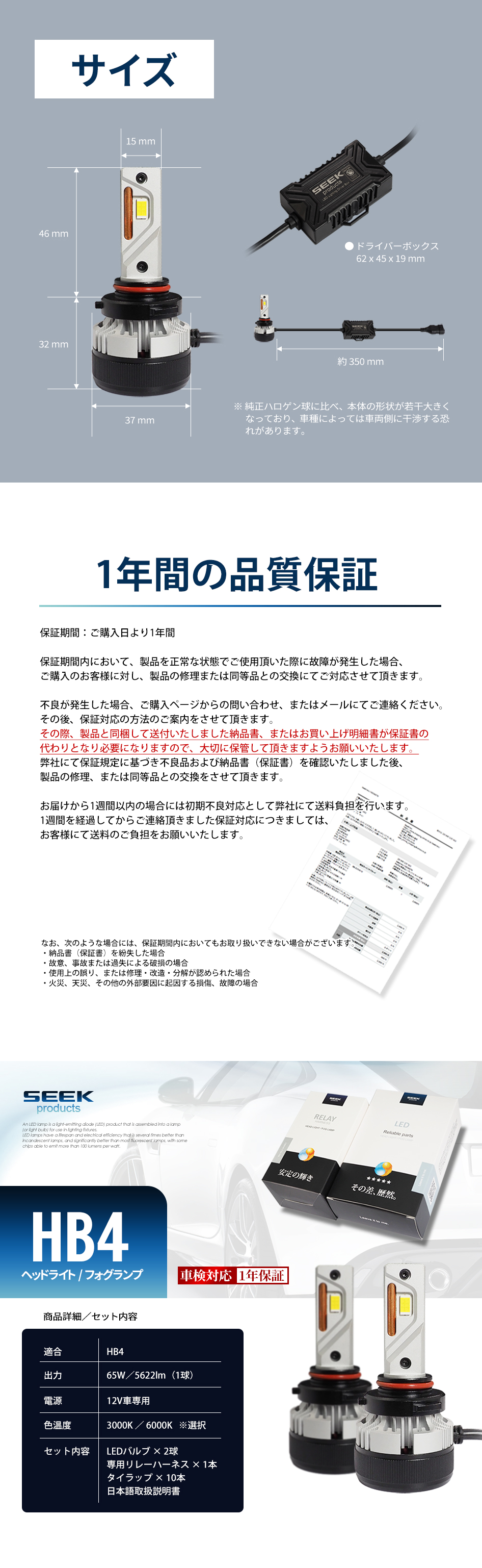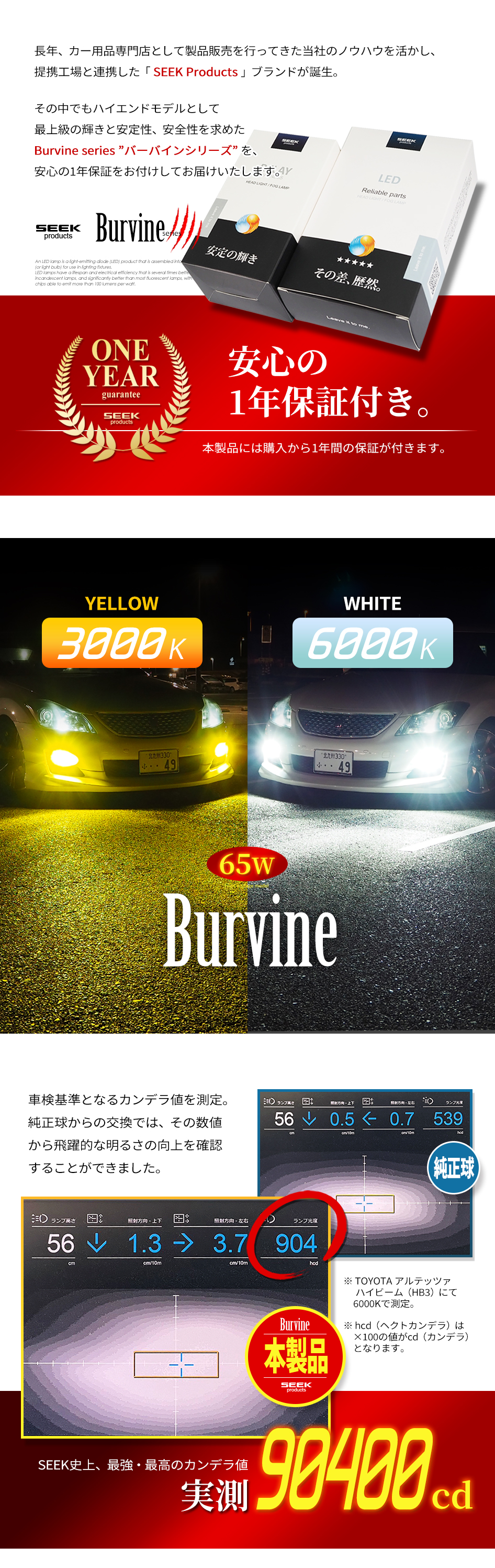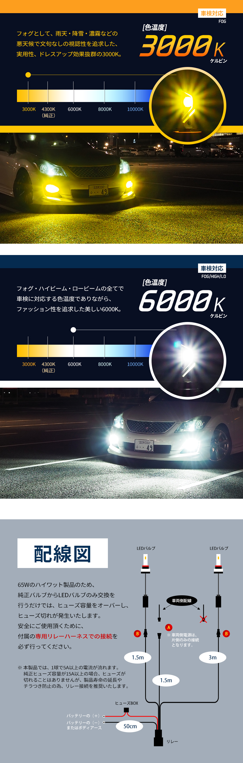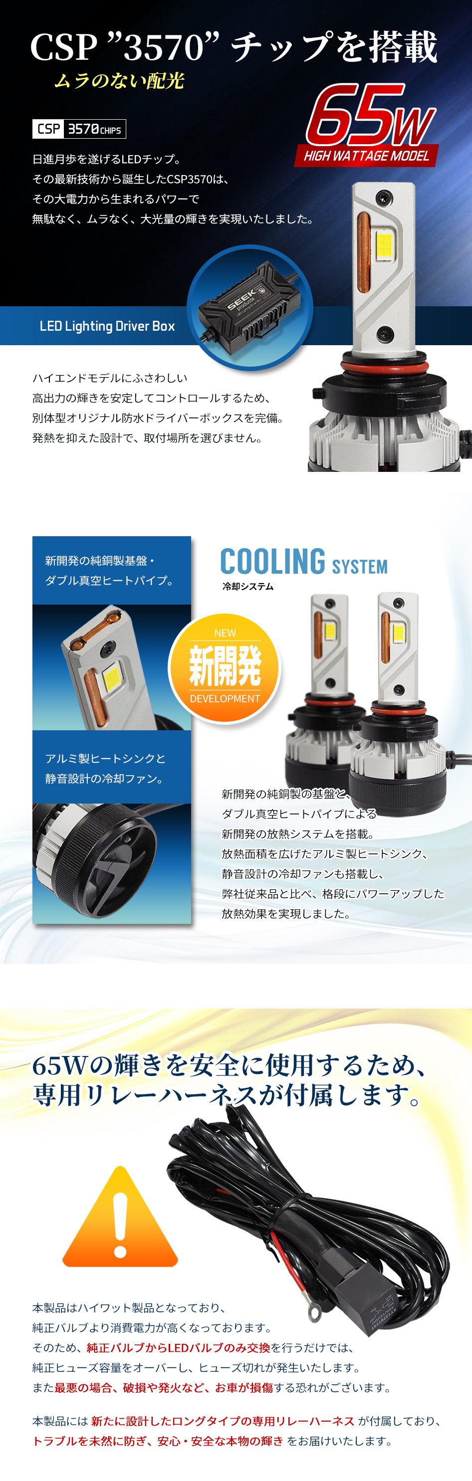 LEDヘッドライト/フォグランプのハイエンドモデル。従来品と一線を画す左右合計11244lmの明るさ。65Wのハイワット出力のため、新たに設計した超ロングタイプの専用リレーハーネスが付属。(形状:H4、H1、H3、H7、H8、H11、H16、HB3、HB4、PSX24W、PSX26W)(色温度:3000K、6000K)