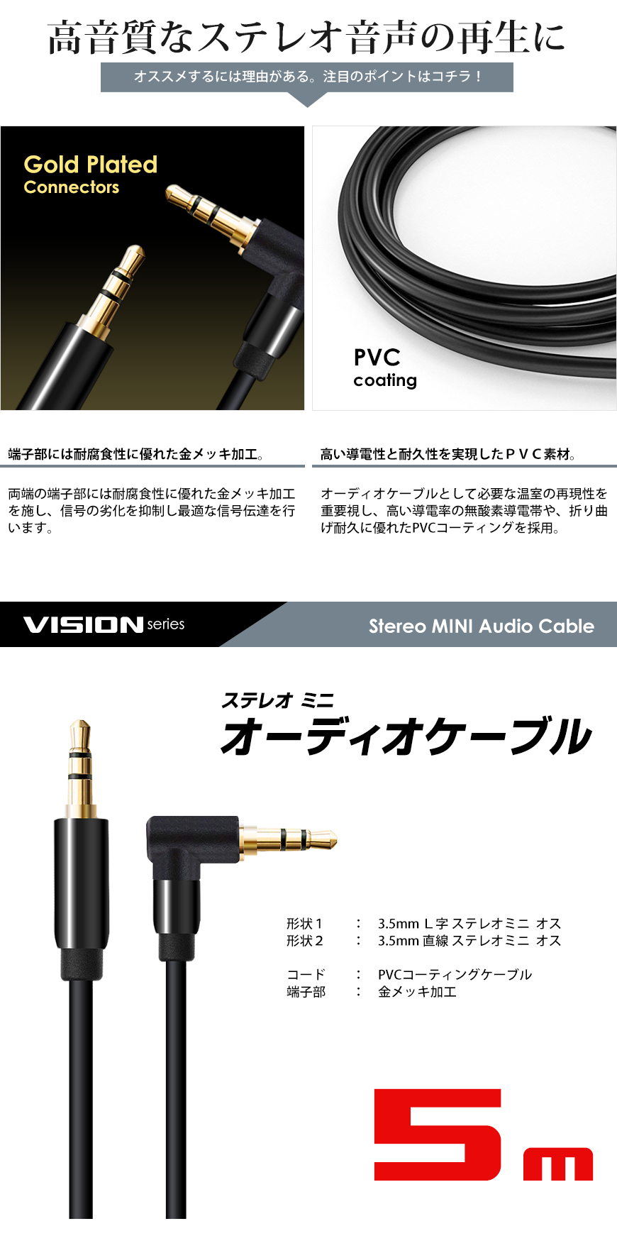 ケーブル・機器関連|音声・映像|オーディオケーブル 直線-L字 5m