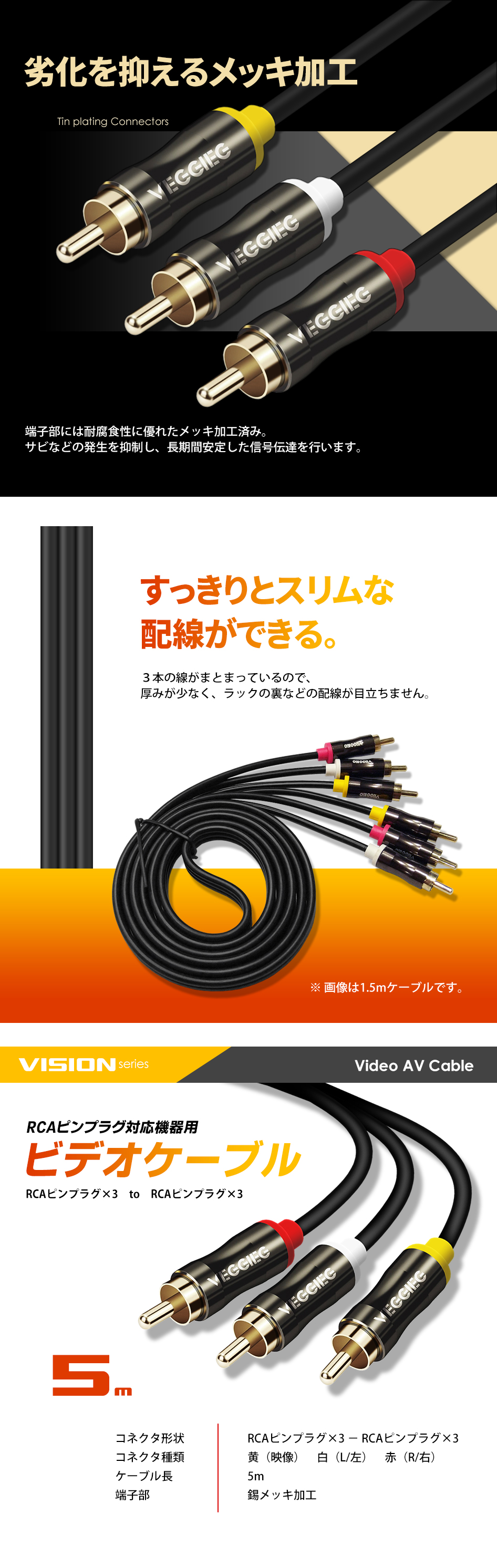 ケーブル・機器関連|音声・映像|ビデオケーブル RCA 3ピン 5m